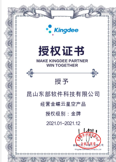 ? 東部軟件榮獲K/3WISE經(jīng)銷商金牌伙伴2021; ? 東部軟件榮獲金蝶云公有云伙伴2021; |