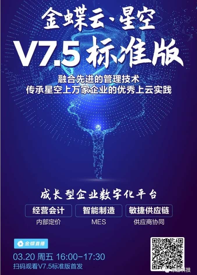 3月20日(今天)下午16:00,金蝶云·星空V7.5標準版正式發(fā)布,金蝶中國助理總裁&金蝶云·星空產(chǎn)品部總經(jīng)理韓革纓、金蝶中國中小微企業(yè)事業(yè)部市場與解決方案中心副總監(jiān)張?zhí)锿?,將現(xiàn)場解讀金蝶云·星空V7.5標準版功能特性,分享標桿企業(yè)的優(yōu)秀實踐。