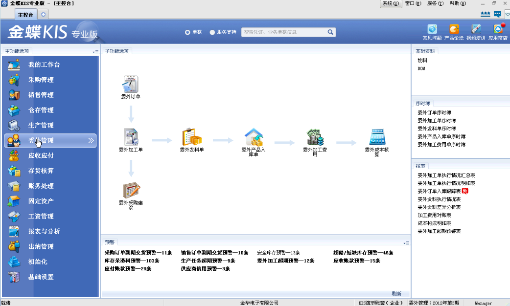 按委外任務(wù)單進(jìn)行發(fā)料控制;委外成本自動(dòng)核算;委外費(fèi)用往來(lái)管理;提供委外訂單執(zhí)行情況跟蹤報(bào)表。